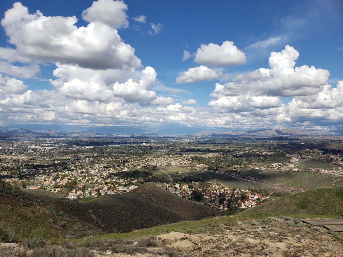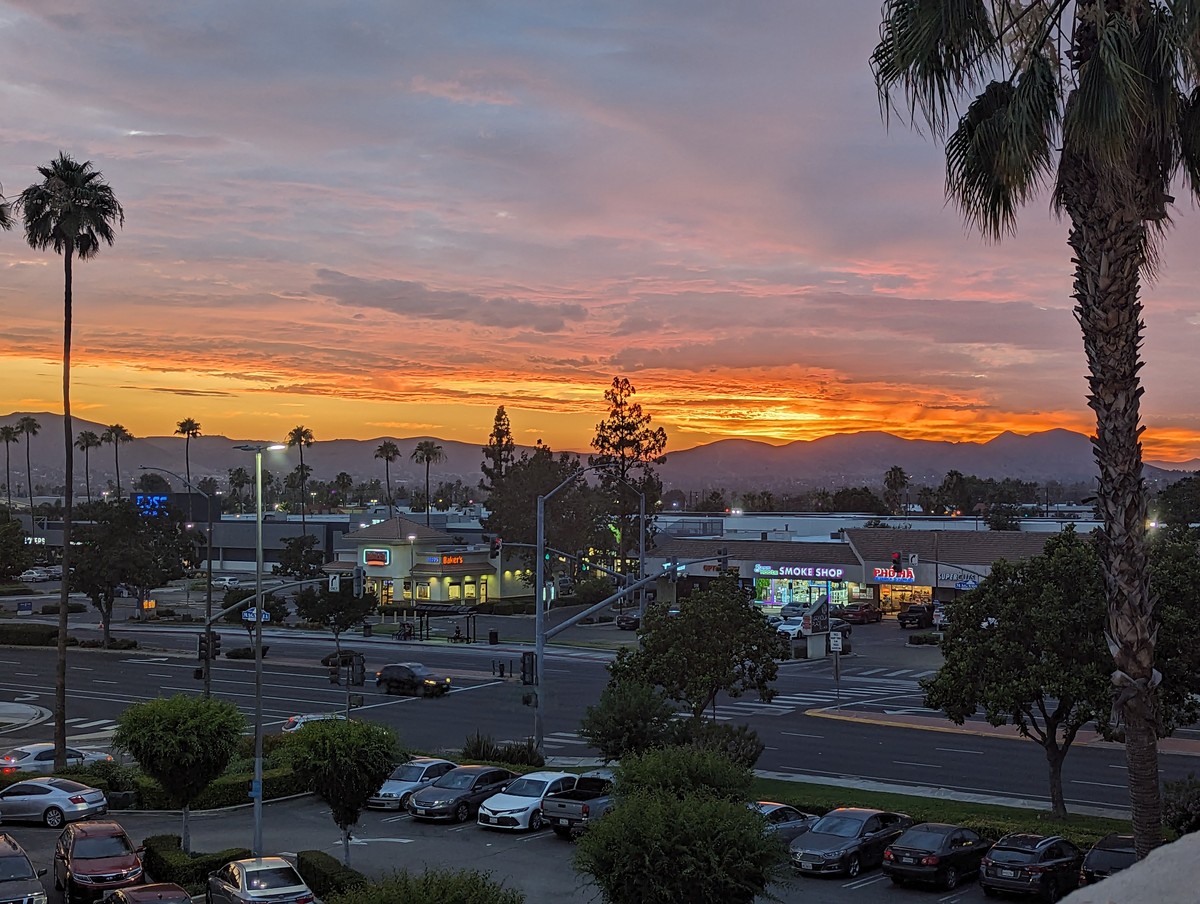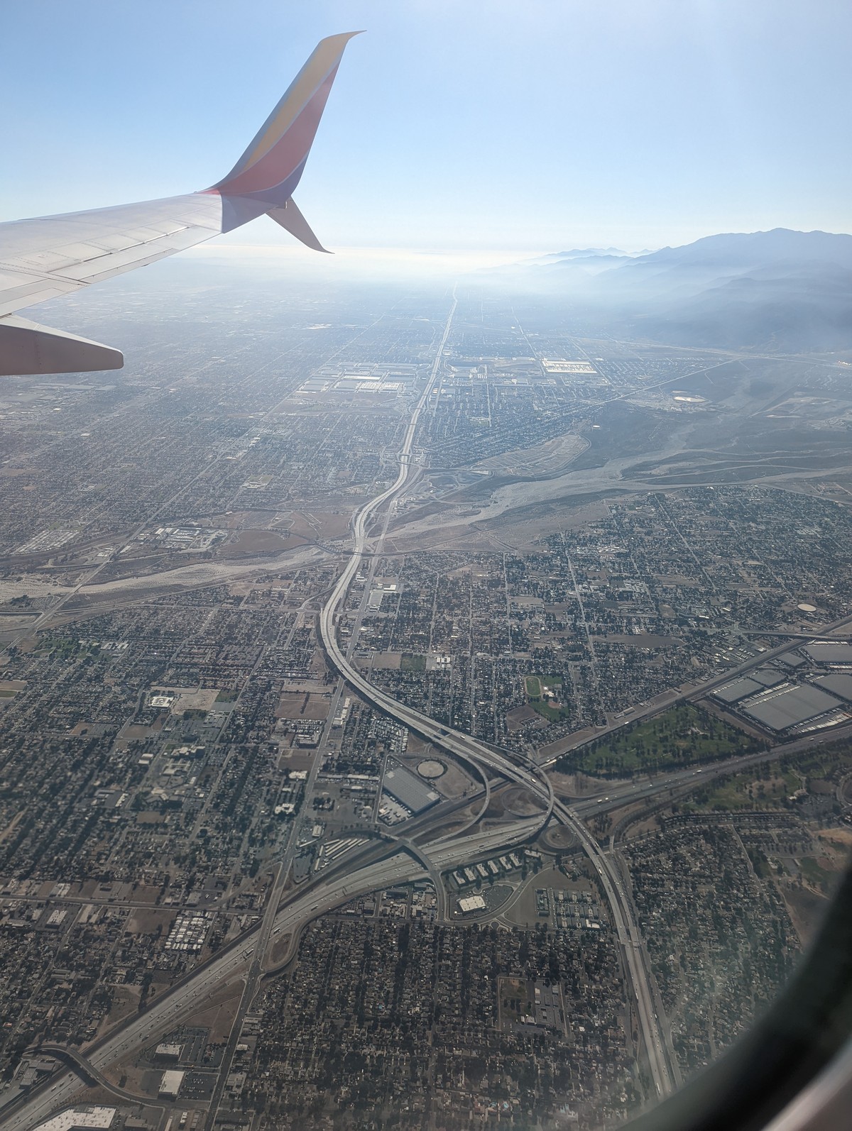 [Image description: a hazy, west facing view from a plane window, the interchange of the 210 and the 215 visible below, the foothills of the San Gabriel mountains on the right side of the photo.
