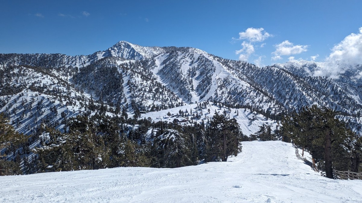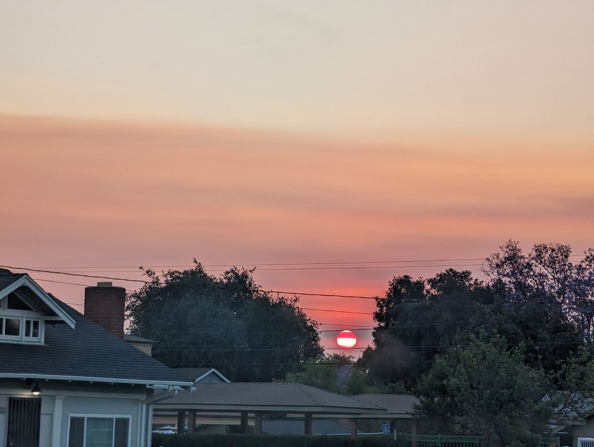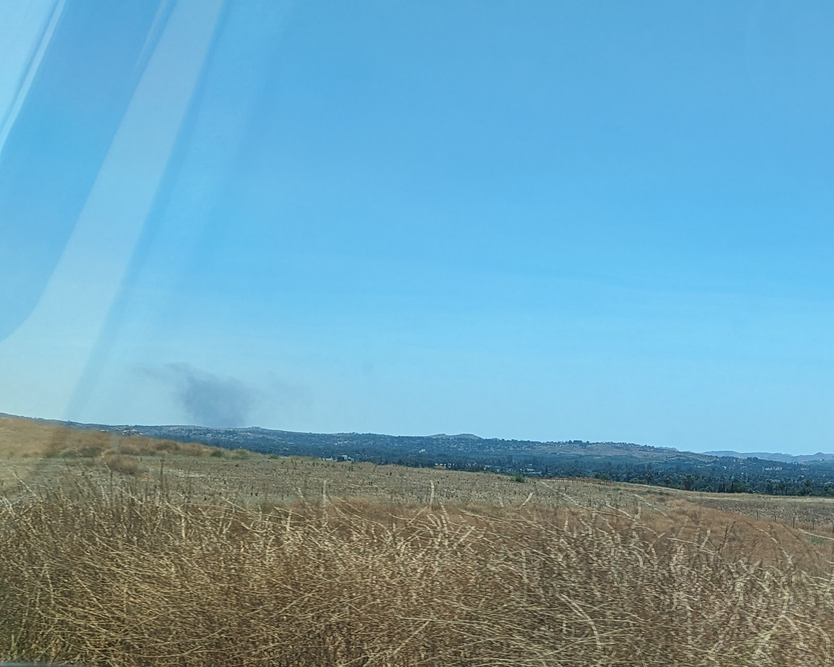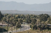 [Image description: a hazy, west facing view from a plane window, the interchange of the 210 and the 215 visible below, the foothills of the San Gabriel mountains on the right side of the photo.
