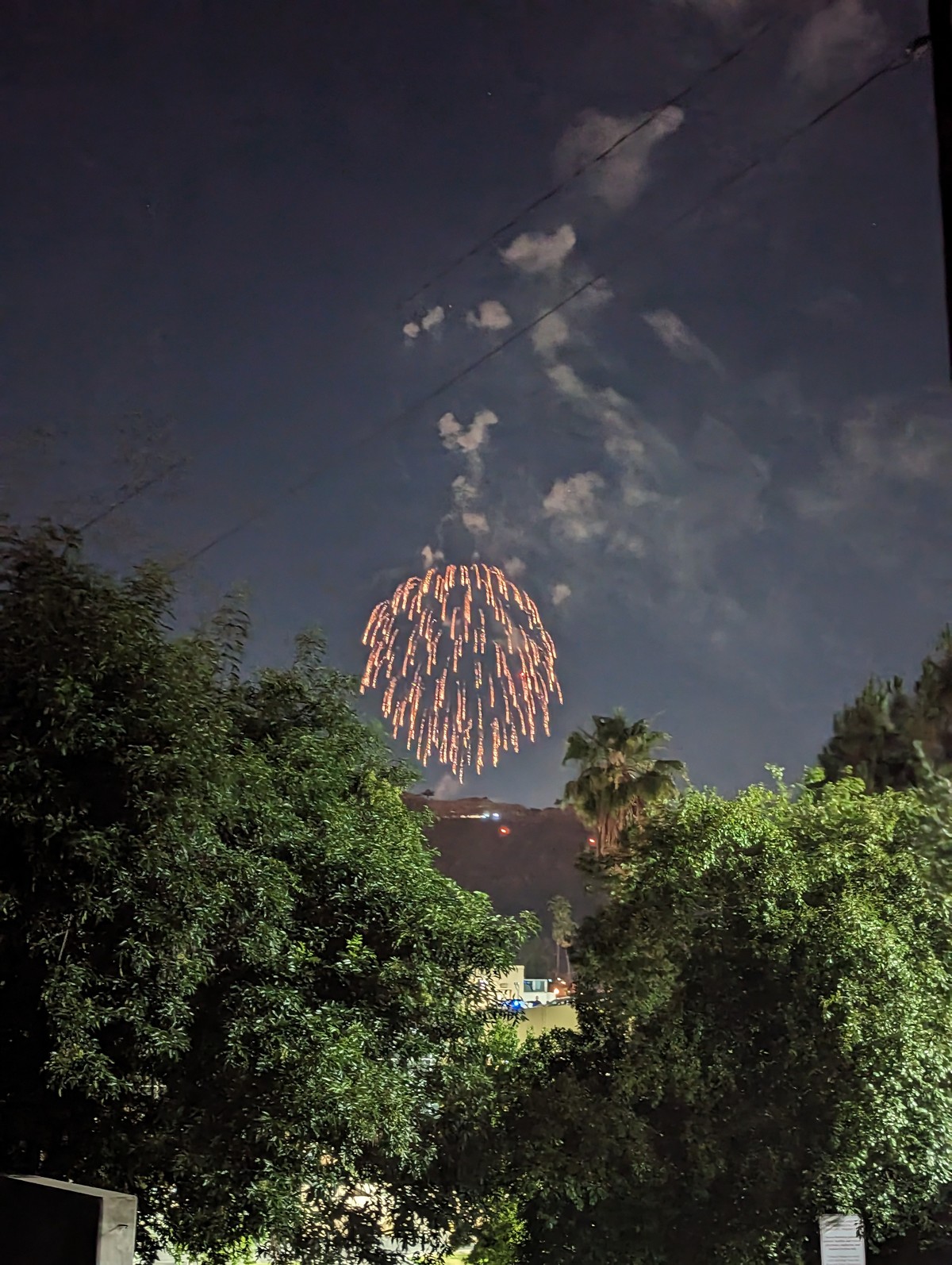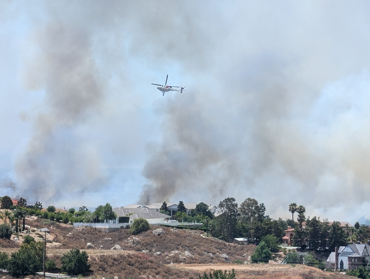 [Image description: a white and red helicopter tilted sideways over large houses on a hilltop covered with brown brush. Multiple plumes of grey smoke are rising from behind the houses, and flames can be seen on the brush on the left side of the photo.]