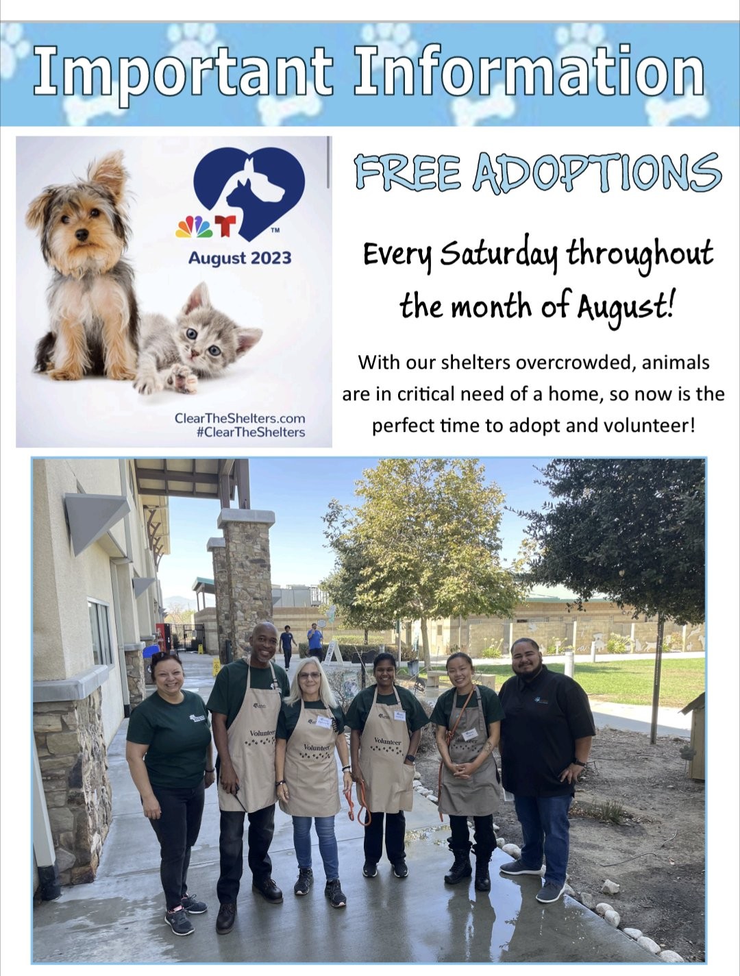 [Image description: a poster that has two photos, one of a kitten and puppy, the other of volunteers posing at one of the shelters. The text says free adoptions every Saturday throughout the month of August.]