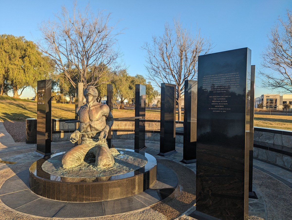 [Image description: a statue of a kneeling chained man with his head pointed towards the sky, and hands held upwards in front of him. The statue is flanked by several polished dark stone pillars with an inscription dedicating the memorial.]