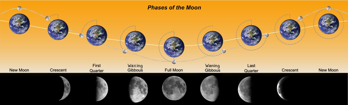 Diagram illustrating various phases of the Moon in their order of appearance starting from the New Moon and progressing through Crescent, First Quarter, and Gibbous to reach the Full Moon. It is followed by Gibbous, Last Quarter and Crescent to complete full circle at the New Moon again.